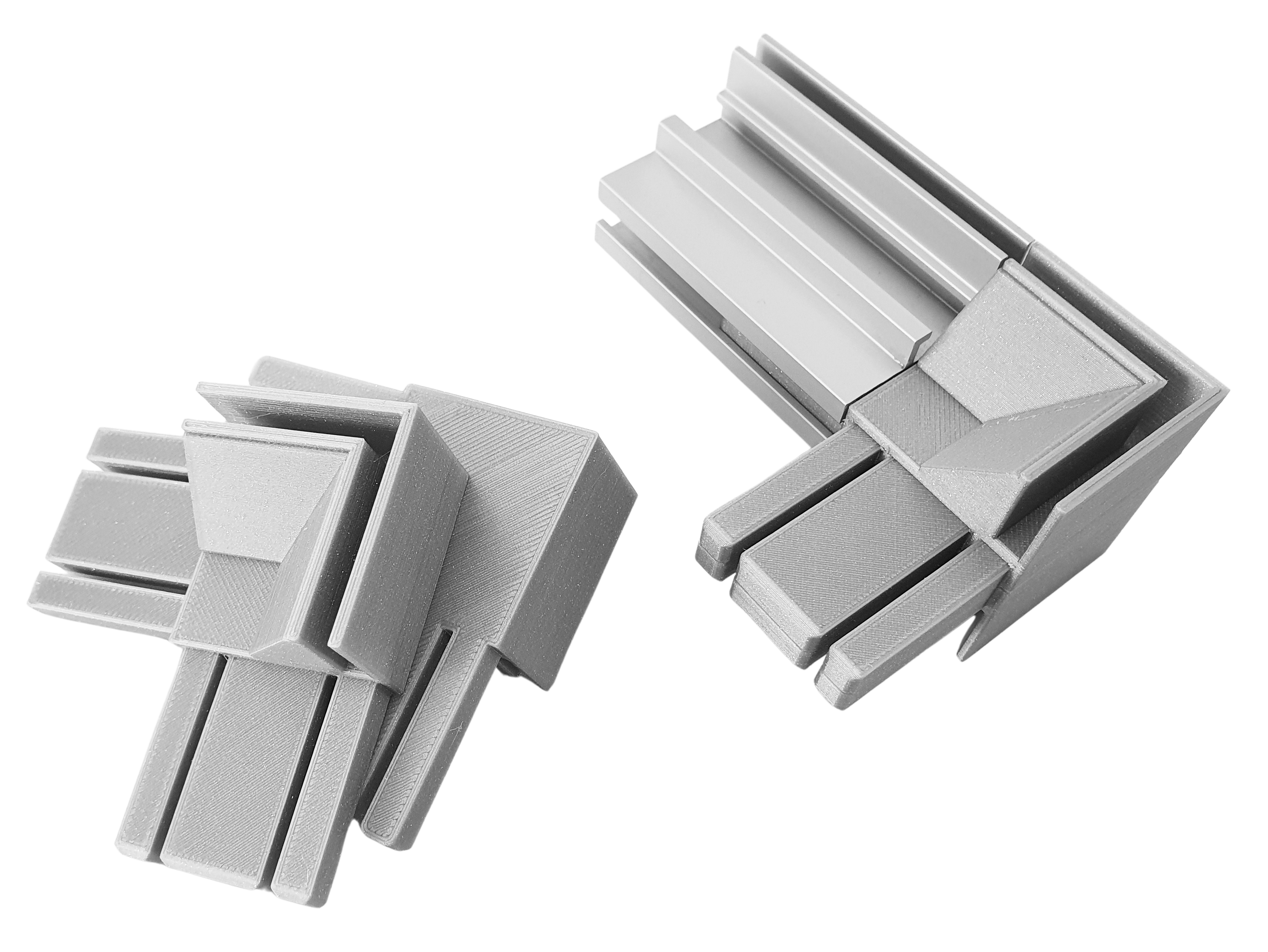 Keine Gehrungsschnitte mehr erforderlich. SMP Eco45 gerade abschneiden und mit diesem Eckverbinder werkzeuglos zusammensetzen. Nach dem Einloggen können Sie kostenlos 3D-Druckdaten herunterladen oder fertig gedruckte Verbinder direkt bei uns bestellen.