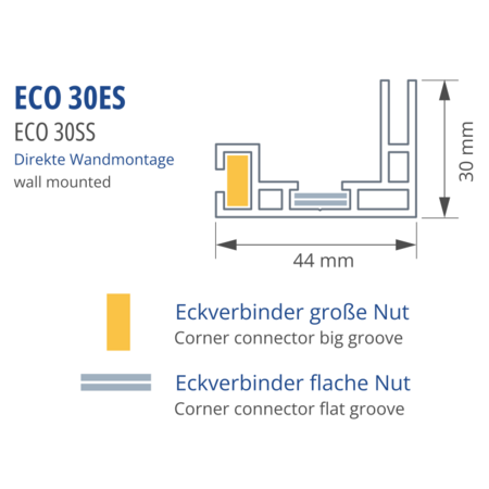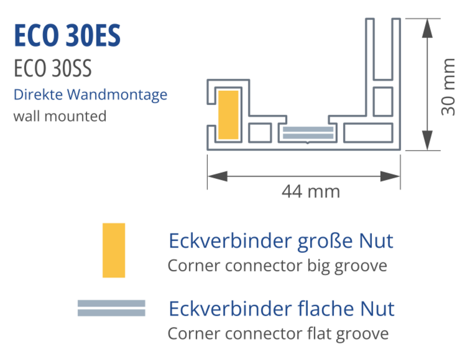 Eckverbinderset für Eco 30es Rahmen. Dieses Set besteht aus 4 Stück Eckverbinder für große Nut und 4 Stück für flache Nut.