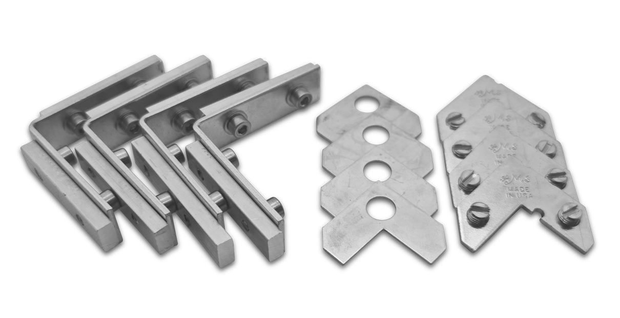 Corner connector set for Eco 30es frames. This set consists of 4 corner connectors for large groove and 4 for flat groove.
