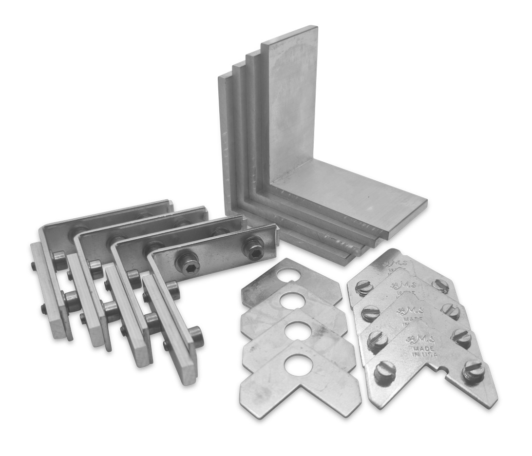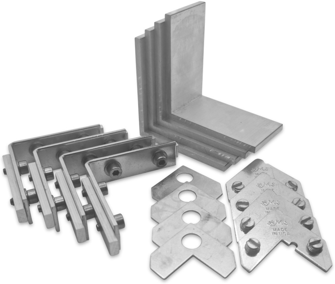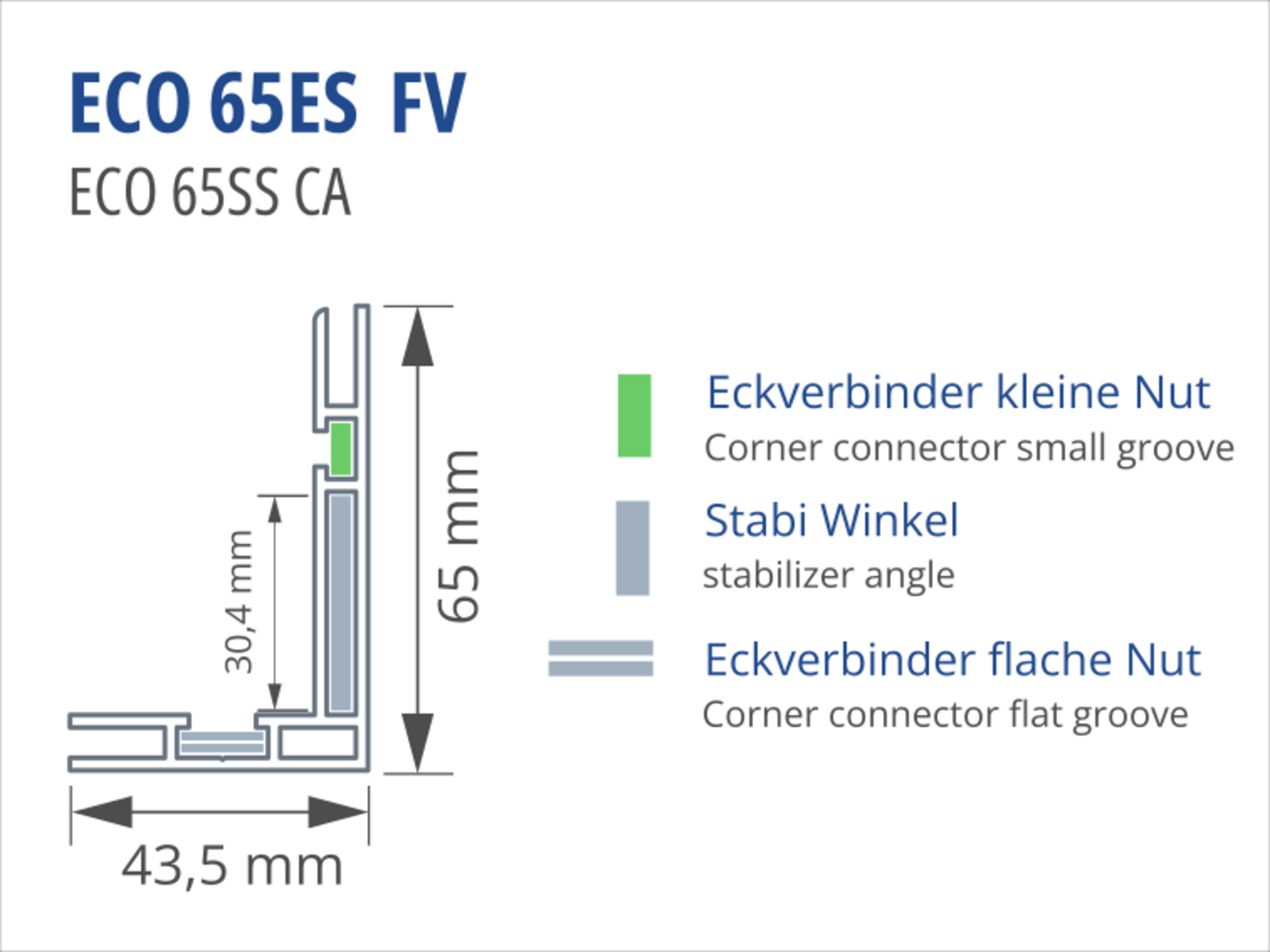 Eckverbinderset für Eco 65es Rahmen. Dieses Set besteht aus je 4 Eckverbindern für kleine Nut, 4 für flache Nut und 4 Eckverbinder Hohlkammer Stabiwinkel 30.4mm