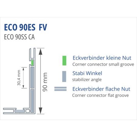 Eckverbinderset für Eco 90es Rahmen. Dieses Set besteht aus je 4 Eckverbindern für kleine Nut, 4 für flache Nut und 8 Stabi Winkeln für Hohlkammer