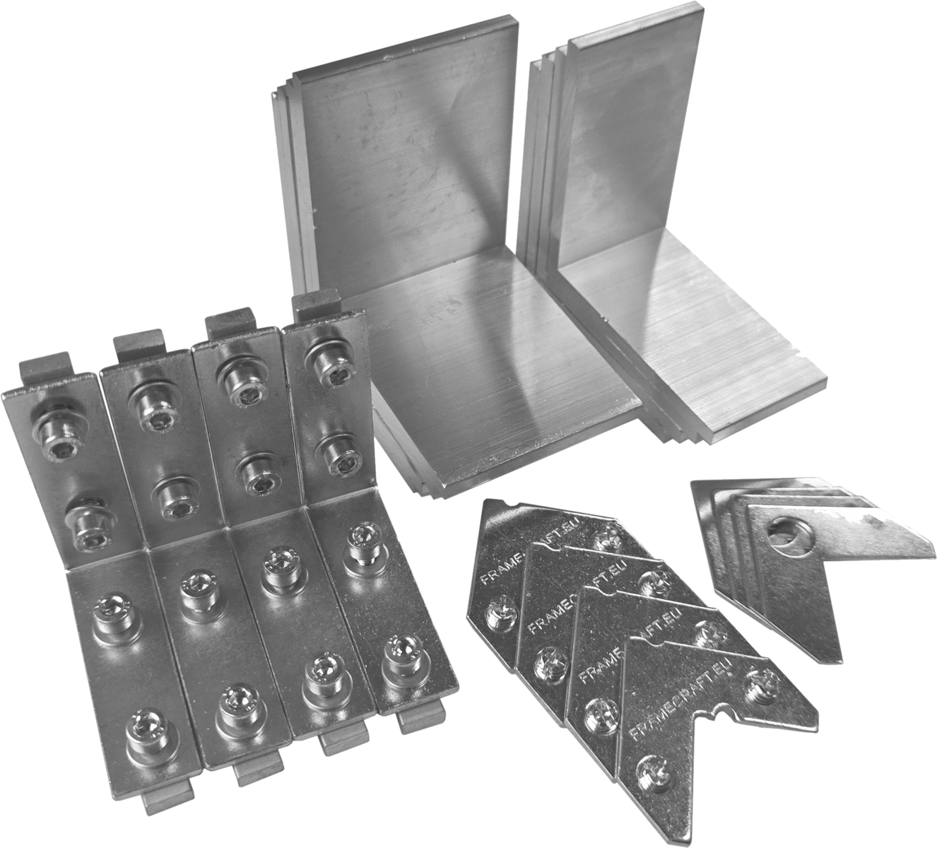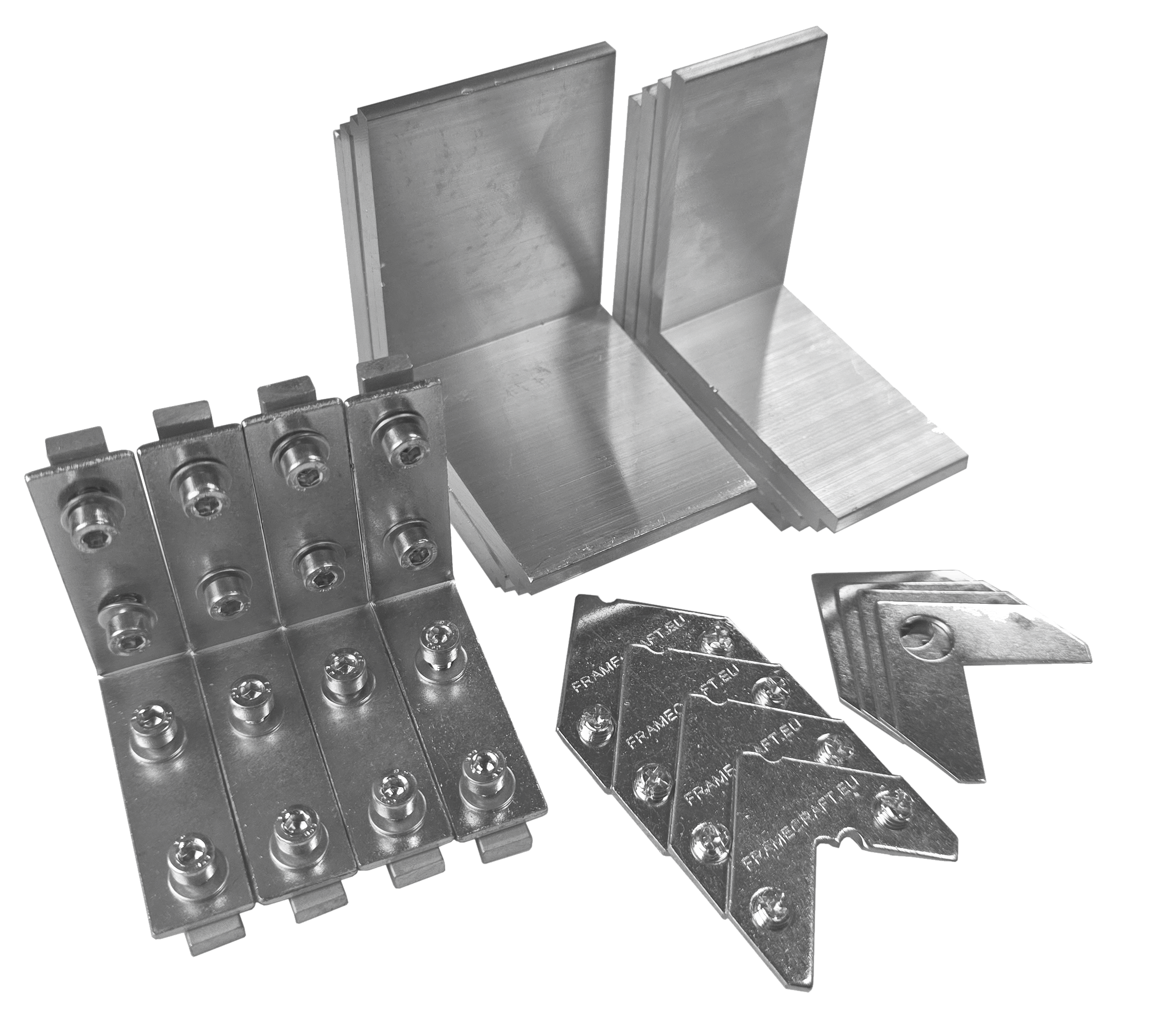 Dieses Set besteht aus 4 Stück Eckverbindern kleine Nut, 4 Stück Eckverbindern flache Nut, 4 Stück Stabis 45,9mm und 4 Stück 35,9mm.