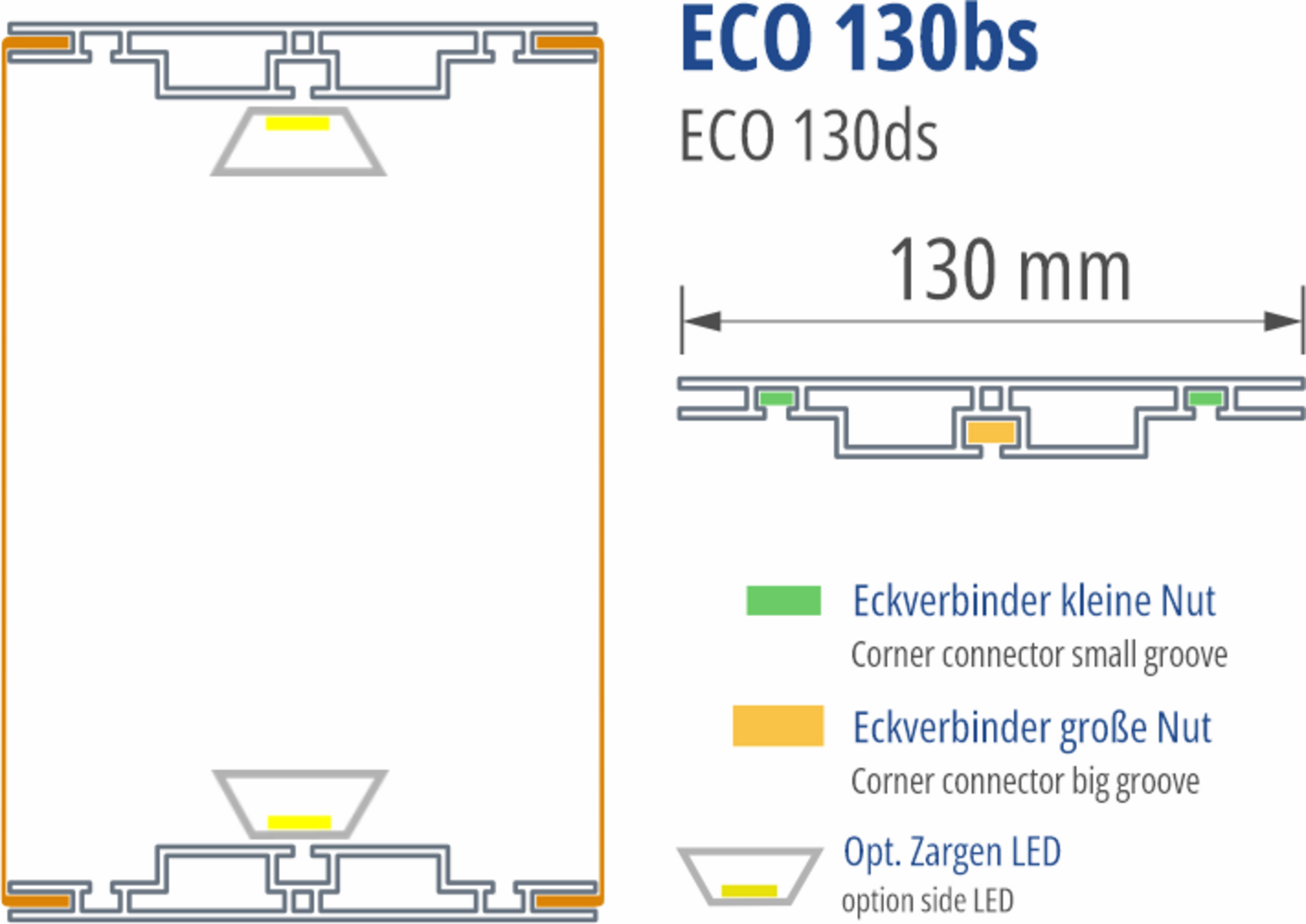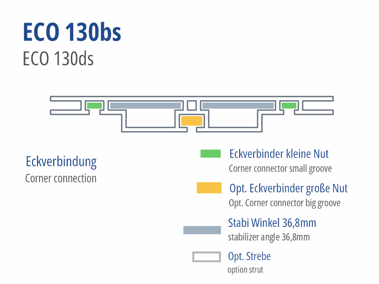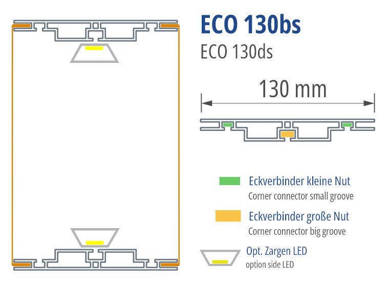 130 mm tiefes Profil zur Herstellung beidseitig leuchtender Anwendungen. Sofern keine der beiden Rahmenseiten ca. 200 cm überschreitet, werden über die Zarge sehr gute Ausleuchtungsergebnisse erzielt. Dank der Verstrebungsaufnahme lassen sich auch großformatige Anwendungen wie Deckenkränze effizient realisieren – besonders vorteilhaft in Kombination mit unserem Innen- und Außeneckprofil. Mit unserem Plexiadapter kann beidseitig anstelle von Spanntuch mit Gummilippe auch Plattenmaterial bis zu 5 mm Stärke eingesetzt werden.