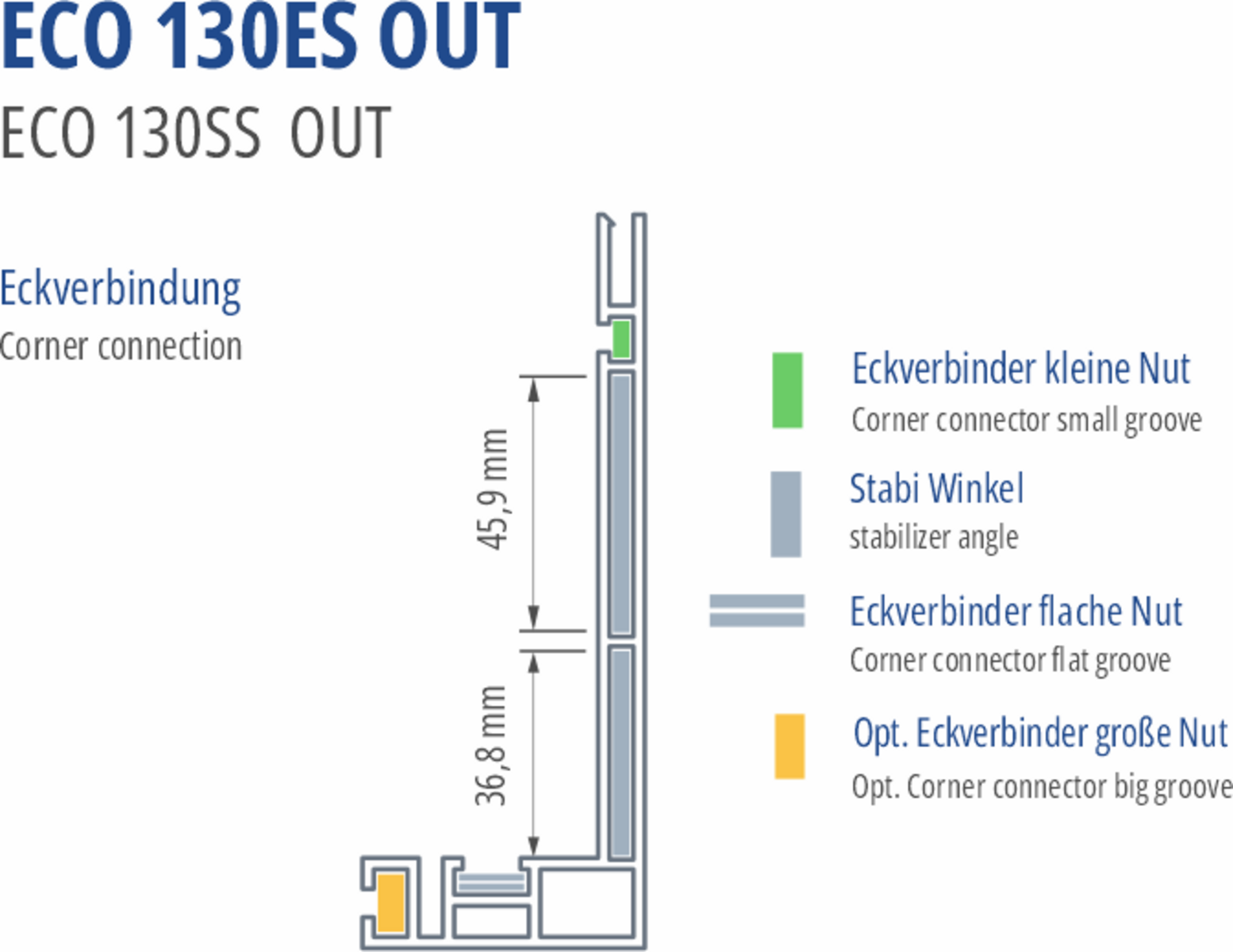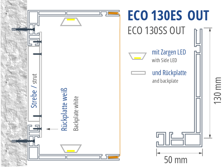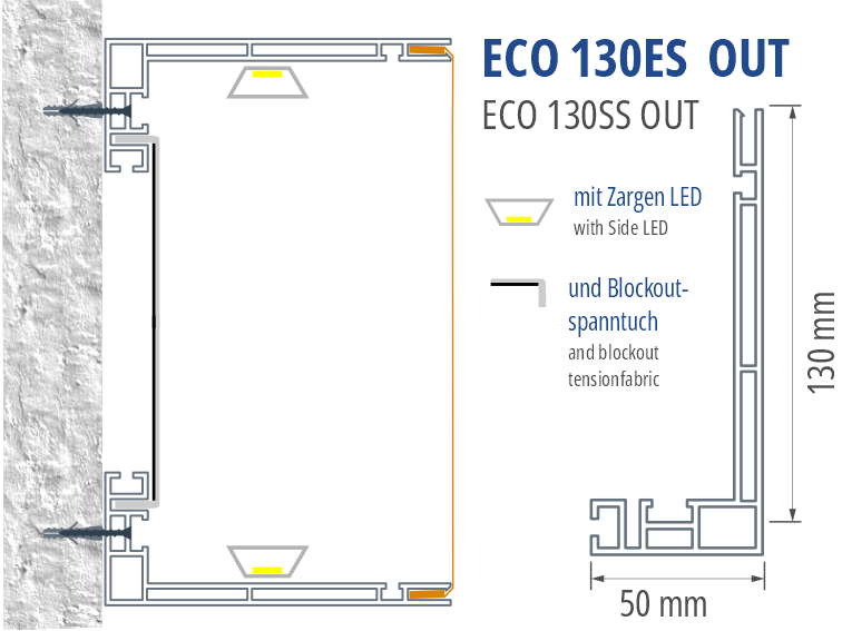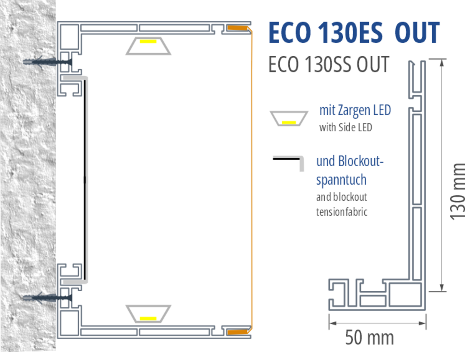 Das Eco 130es OUT ist ein eloxiertes Aluminiumprofil für große einseitige LED-Leuchtrahmen im Außenbereich. Die integrierte Gummilippentechnik mit Widerhaken sorgt für sichere Tuchverankerung auch bei Wind. Das Profil verfügt über einen eigenen Schraubkanal und wird alle 30-70 cm direkt an der Wand oder Unterkonstruktion verschraubt. Die tiefe Flachbandnut mit Widerhaken nimmt Spanntücher mit Gummilippe auf. Nach der Profilmontage kann eine weiße Rückwand als Spanntuch eingesetzt werden. Verstrebungen lassen sich über Schnellspannschlösser befestigen. Mit 2,8W LED-Modulen erreicht das Profil homogene Ausleuchtung bis 3 Meter, mit Ultra LEDs sogar bis 5 Meter. Der Widerhaken sichert das Spanntuch zuverlässig gegen Sturmeinwirkung. Geeignet für mittlere und große Fassadenwerbeanlagen, Schilderanlagen und LED-Leuchtrahmen im gewerblichen Außeneinsatz.