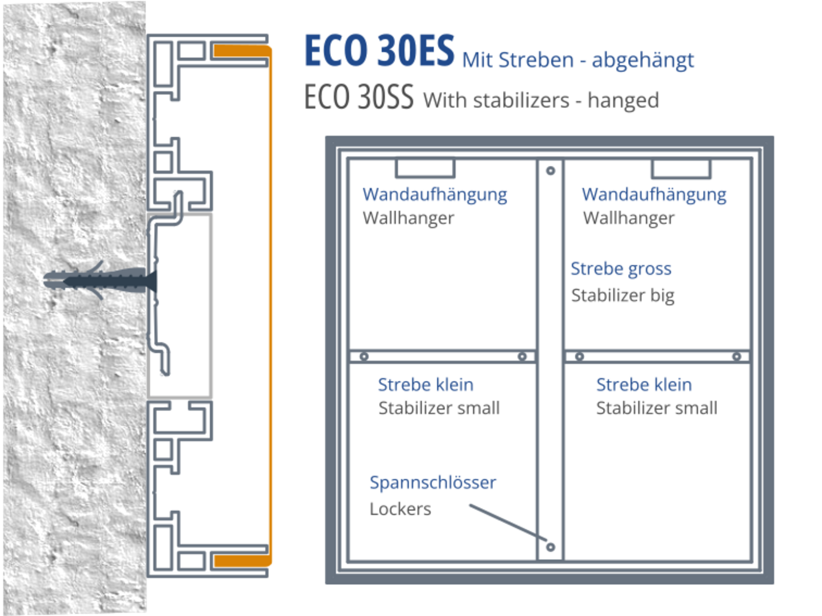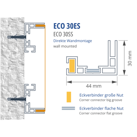 Einseitiges 30mm Profil für eigenstabile Rahmen mit Gummilippentechnik. Kann direkt an die Wand geschraubt werden, mit Verstrebung sind aber auch eigenstabile Rahmen möglich, die gehängt werden können.