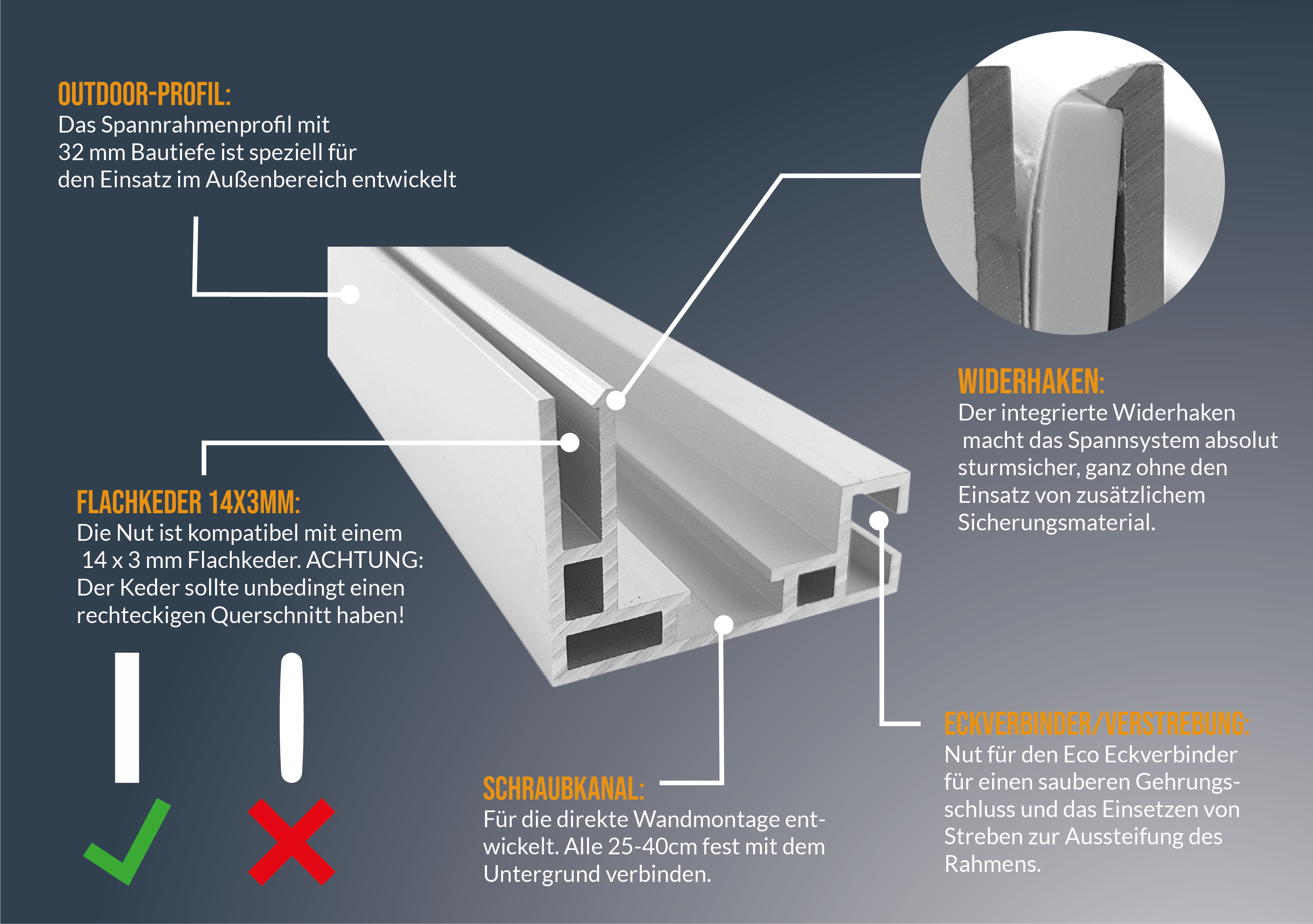 Das Profil für unbeleuchtete Gummilippenspannrahmen im AUSSENBEREICH! Der Widerhaken am innenliegenden Steg sorgt für absolut sicheren Halt des Spanntuches OHNE jegliche zusätzliche Sicherung!