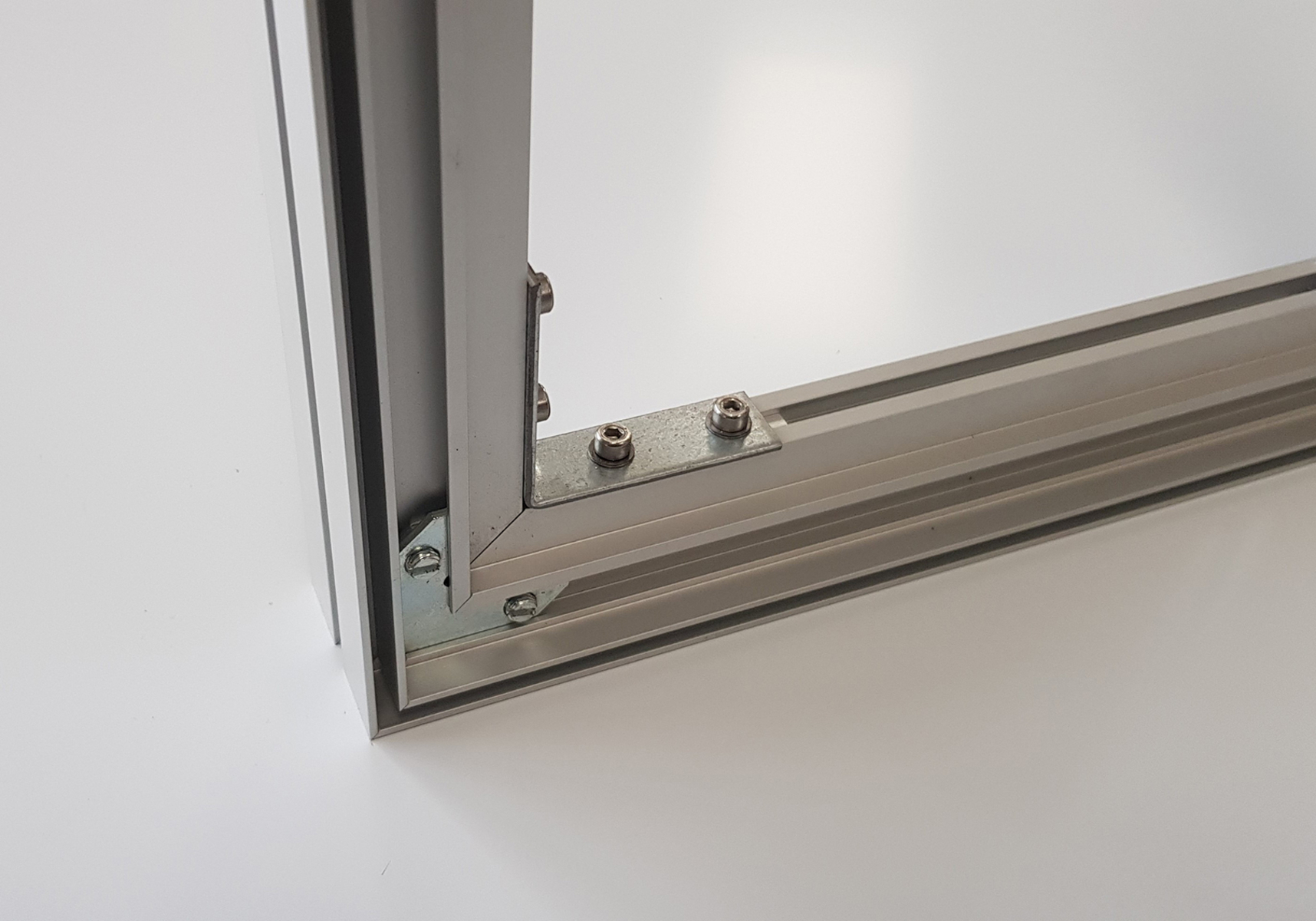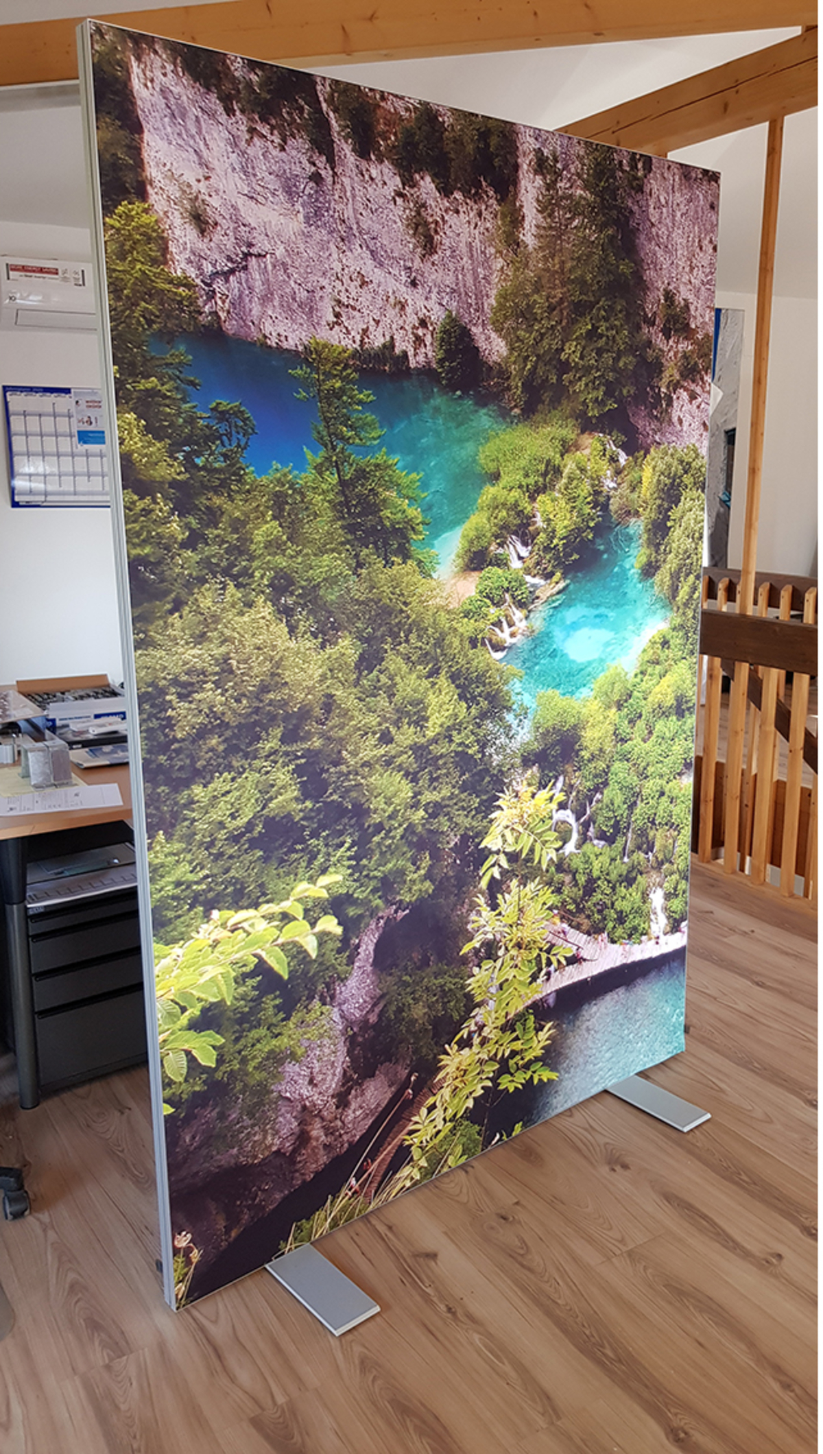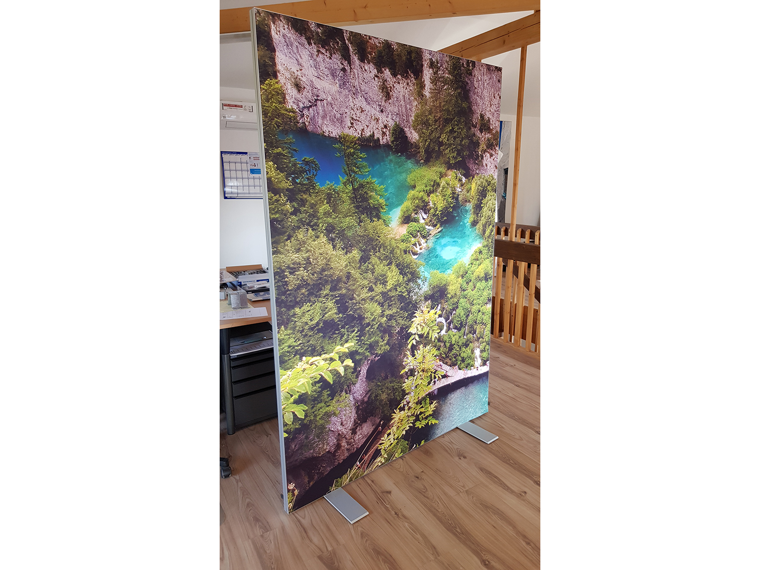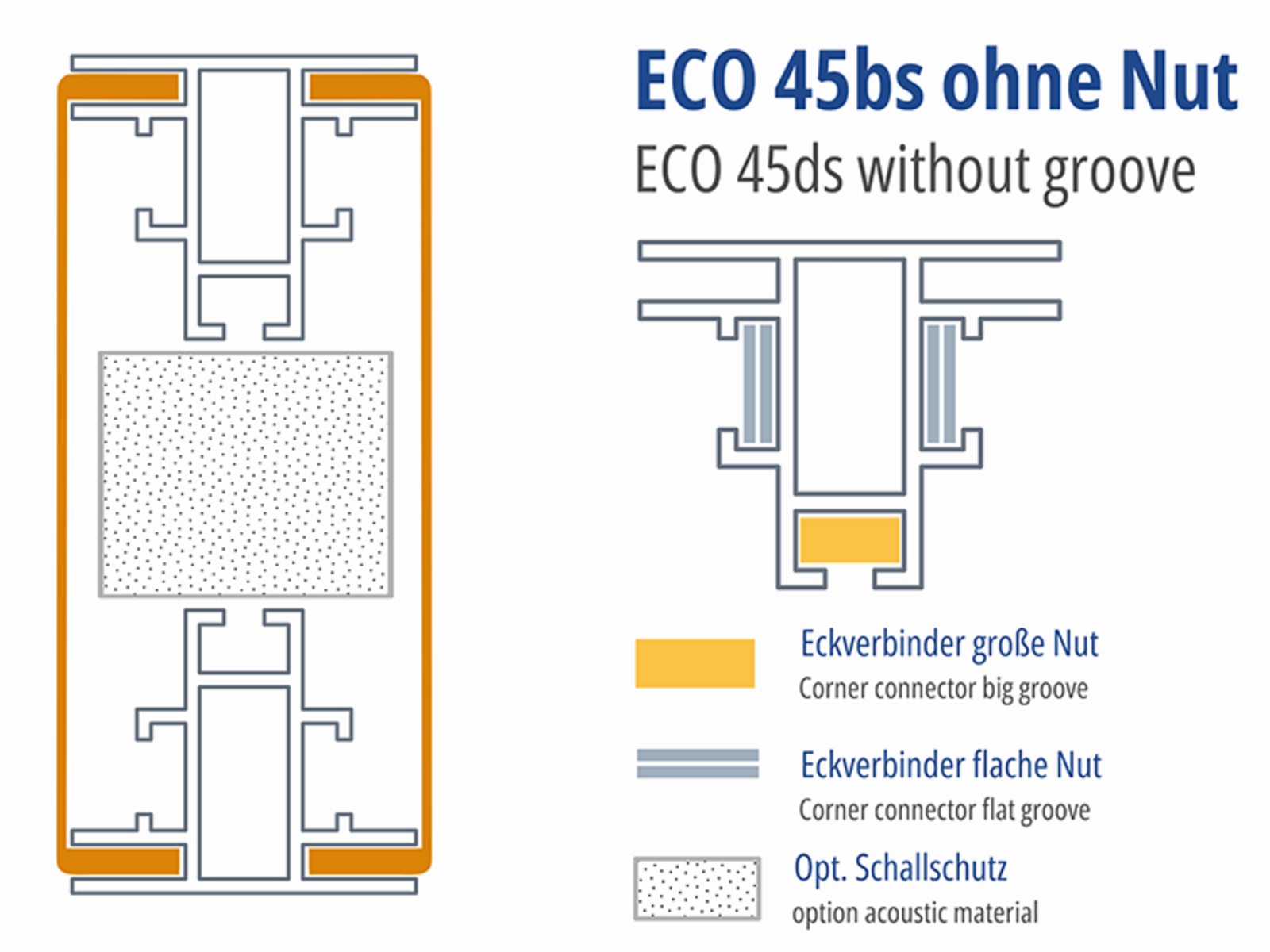 Schlankes, aber stabiles Aluminiumprofil zur Herstellung beidseitiger Anwendungen. In Kombination mit unseren Fußlösungen wird es häufig für Aufsteller oder Raumteiler eingesetzt. Mit unseren Stahlseilabhängungen realisieren Sie elegante Deckenabhänger als Werbeträger oder Leit- bzw. Informationssystem. Kombiniert mit unserem 30-mm-Akustikmaterial lassen sich alle diese Produkte zusätzlich schallhemmend ausführen. Für eine einfachere Montage von Füßen oder Abhängungen kann dieses Profil mit dem Eco 45bs mit Nut kombiniert werden. Zur Frontbeleuchtung können oben unsere LED-Fluter montiert werden.