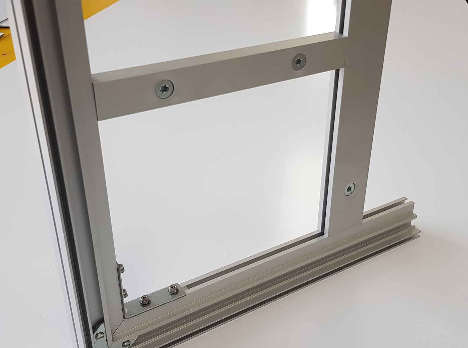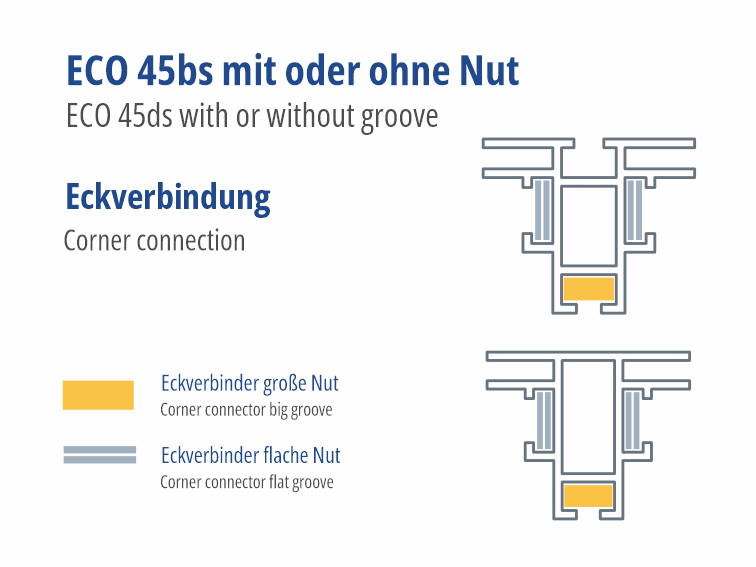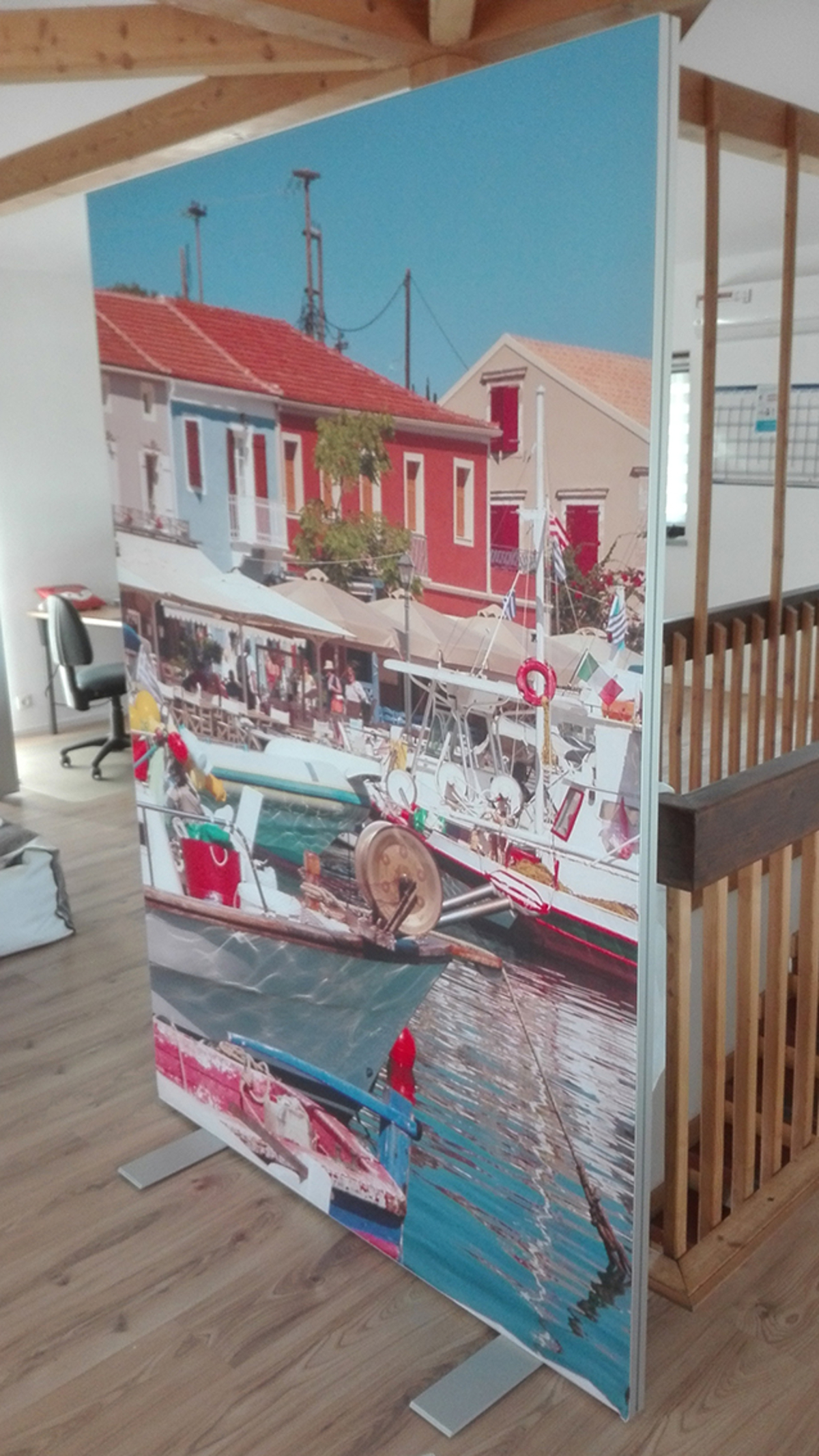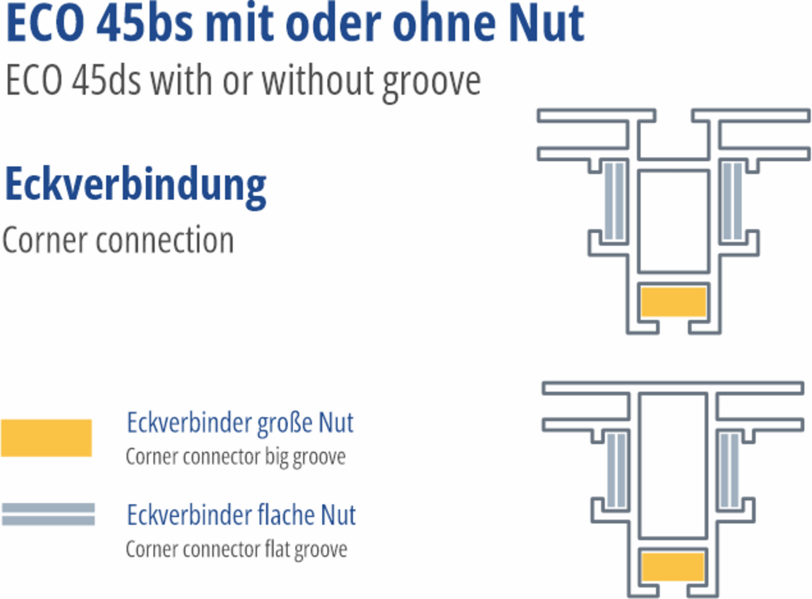 Schlankes, aber stabiles Aluminiumprofil zur Herstellung beidseitiger Anwendungen. In Kombination mit unseren Fußlösungen wird es häufig für Aufsteller oder Raumteiler eingesetzt. Mit unseren Stahlseilabhängungen realisieren Sie elegante Deckenabhänger als Werbeträger oder Leit- bzw. Informationssystem. Kombiniert mit unserem 30-mm-Akustikmaterial lassen sich alle diese Produkte zusätzlich schallhemmend ausführen. Für eine einfachere Montage von Füßen oder Abhängungen kann dieses Profil mit dem Eco 45bs mit Nut kombiniert werden. Zur Frontbeleuchtung können oben unsere LED-Fluter montiert werden.