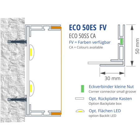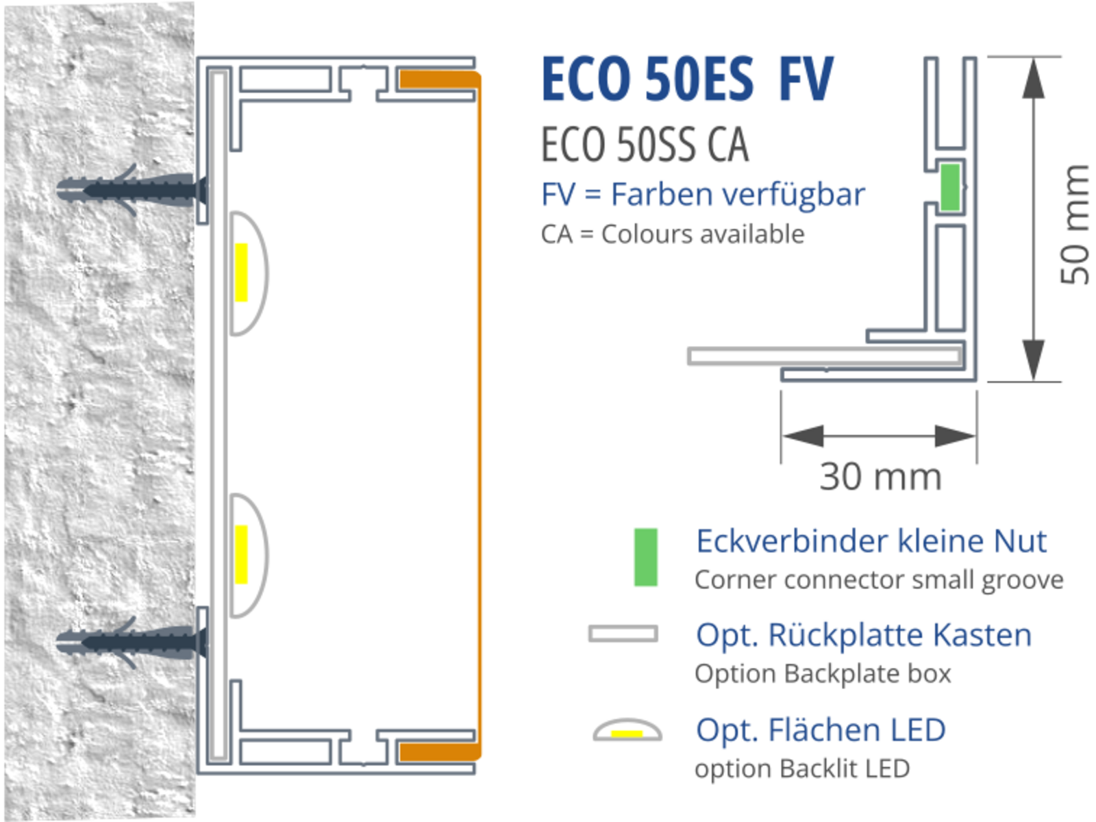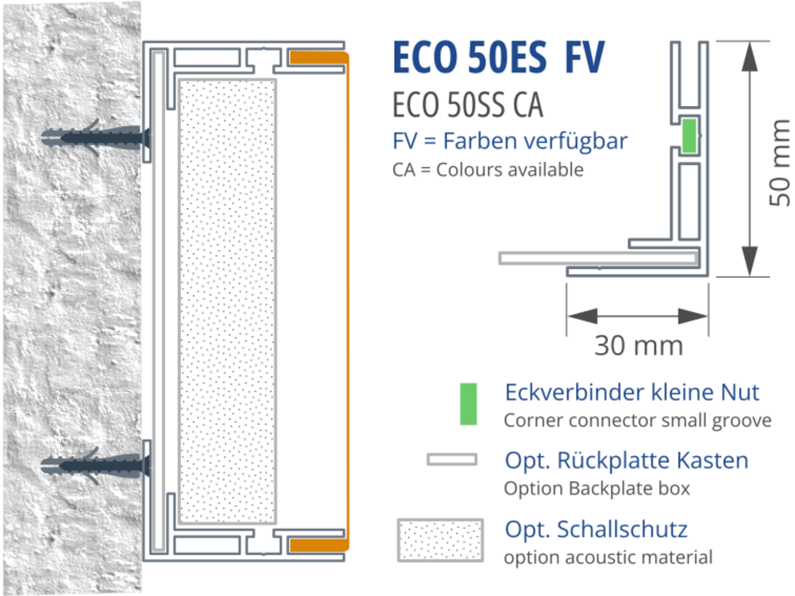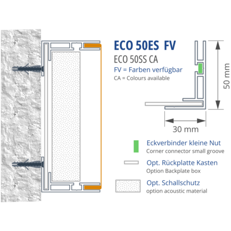 Einseitiges Flachbandprofil mit 50mm Bautiefe für sehr schlanke Leuchtkästen oder Schallschutzbilder.