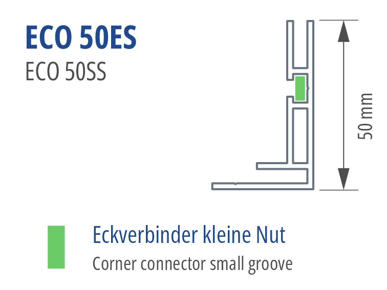 Systemkompatibilität über Eckset Eco 50es für rechtwinklige Rahmen. Nicht kompatibel mit doppelseitigen Eckverbindern oder Outdoor-Zubehör der Eco-Serie.