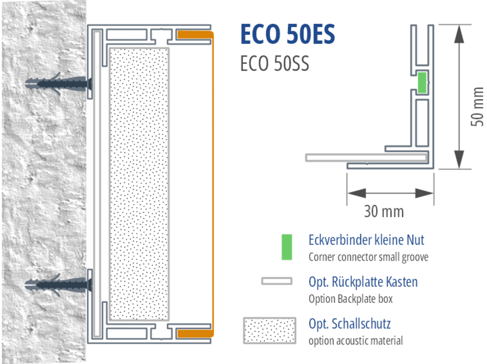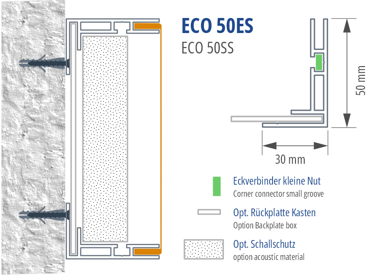 Das Eco 50es ist ein einseitiges Indoor-Leuchtkasten-Profil mit 50mm Bautiefe für flache Wandmontage-Leuchtkästen. Montage über Rückplatten oder untere Leiste zuerst mit versenkten Schrauben. Eigenstabilität bis Format 1.000×1.500mm ohne zusätzliche Verstärkung.