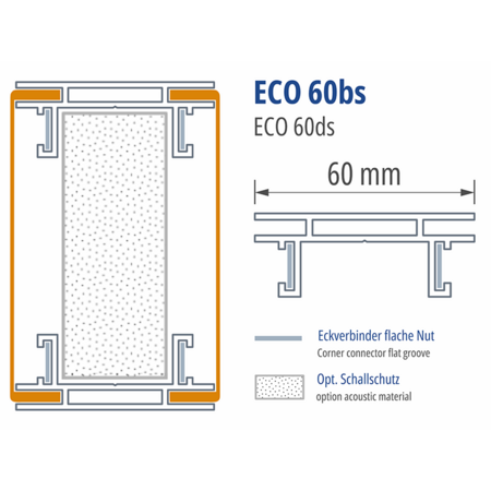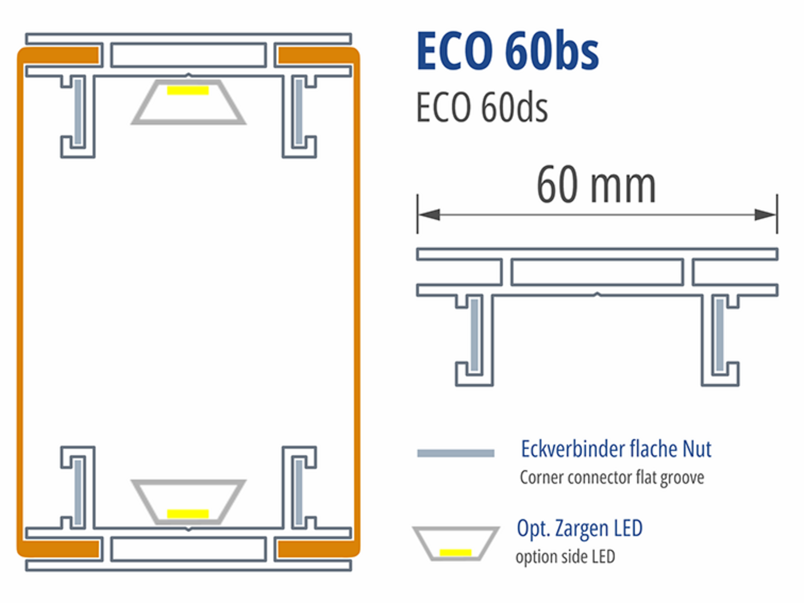 60mm Bautiefe ermöglicht die Herstellung kleinerer, beidseitiger Leuchtschilder. Sehr günstige Lösung, bei Zargeneinstrahlung motivabhängig begrenzt homogene Lichtergebnisse.