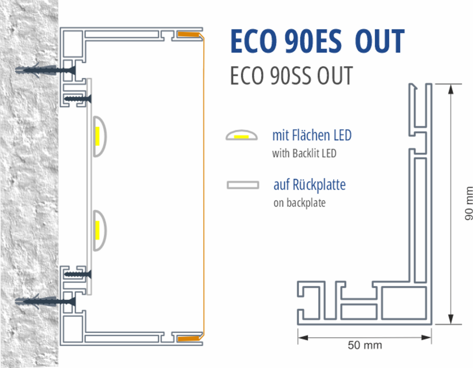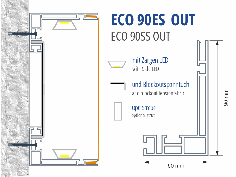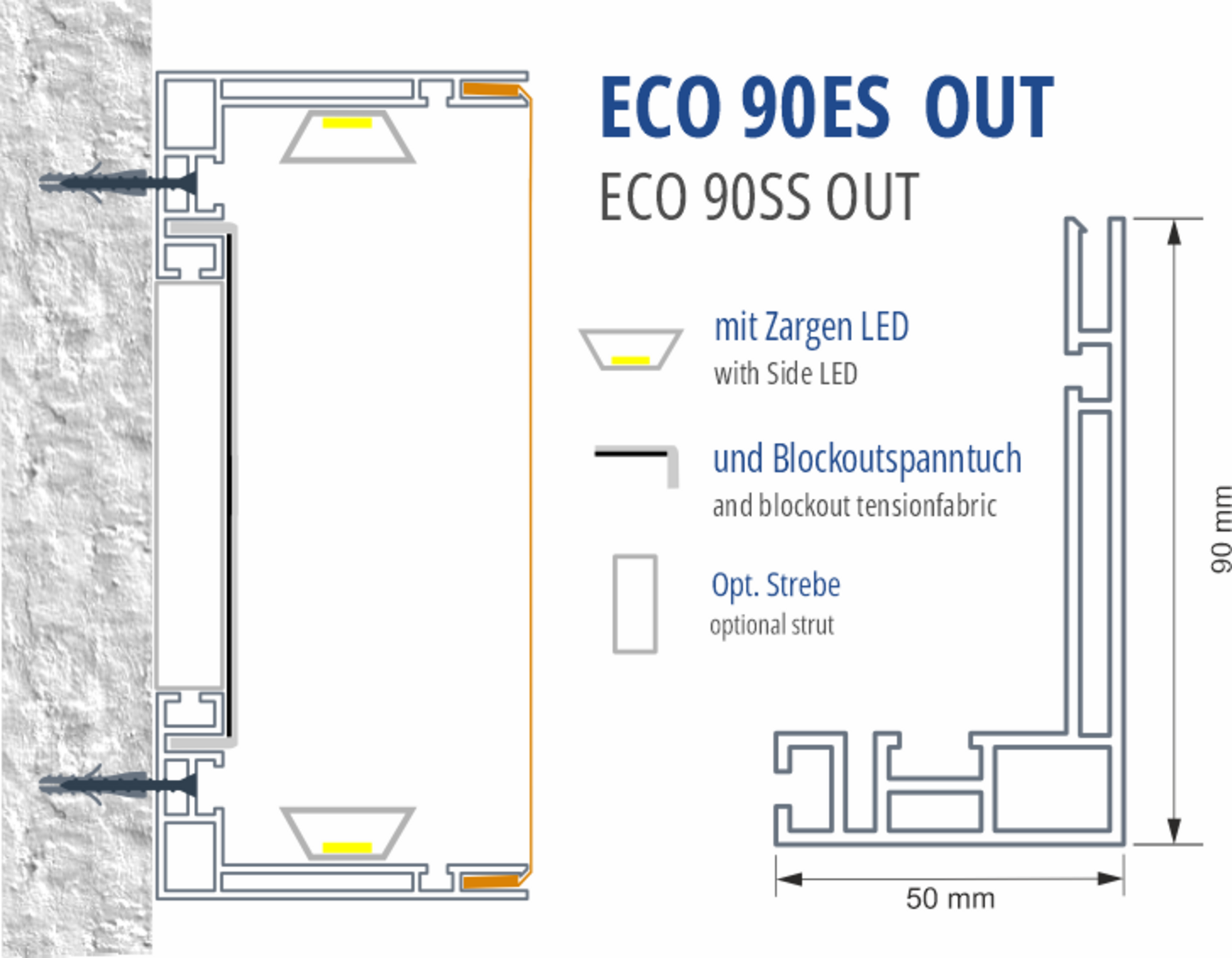 Gummilippentechnik für den Außenbereich mit vertiefter Flachbandnut und Widerhaken zur Tuchverankerung. Zur Installation mittlerer und großer einseitiger LED-Leuchtwerbeanlagen an Fassaden oder geeigneten Unterkonstruktionen. Das Profil wird direkt an der Wand verschraubt. Als Rückplattenersatz kann ein Blockoutspanntuch mit Gummilippe eingesetzt werden. Verstrebungen werden mit Schnellspannschlössern aufgenommen.