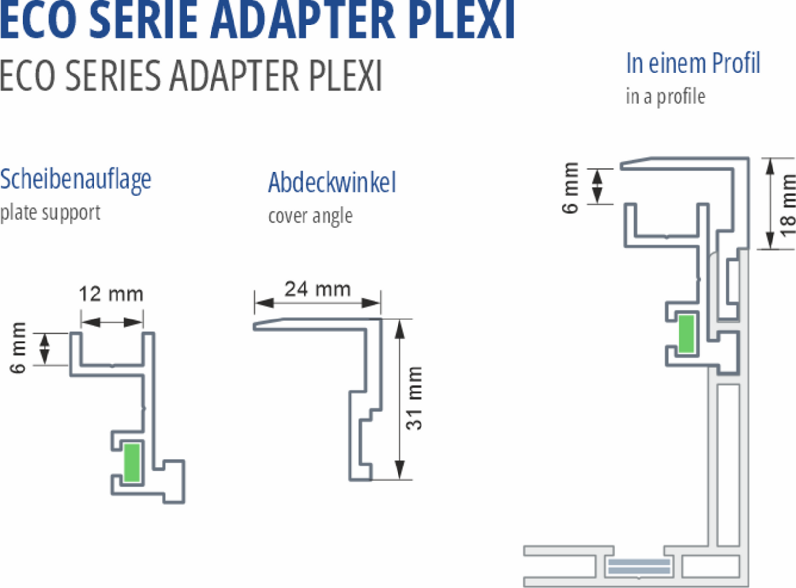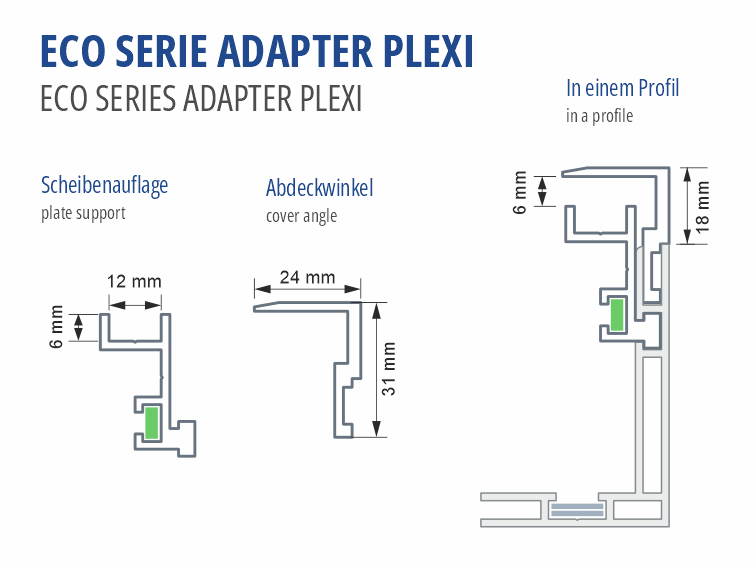 Verwandeln Sie die meisten unserer einseitigen und beidseitigen Gummilippenprofile in Plattenprofile, z.Bsp. für Plexiglasscheiben. Dieser Adapter ist 2 teilig und besteht aus der Scheibenauflage, die in die kleine Eckverbindernut eingesetzt werden kann und dem Abdeckwinkel. Platten bis 6mm Stärke können eingesetzt werden.