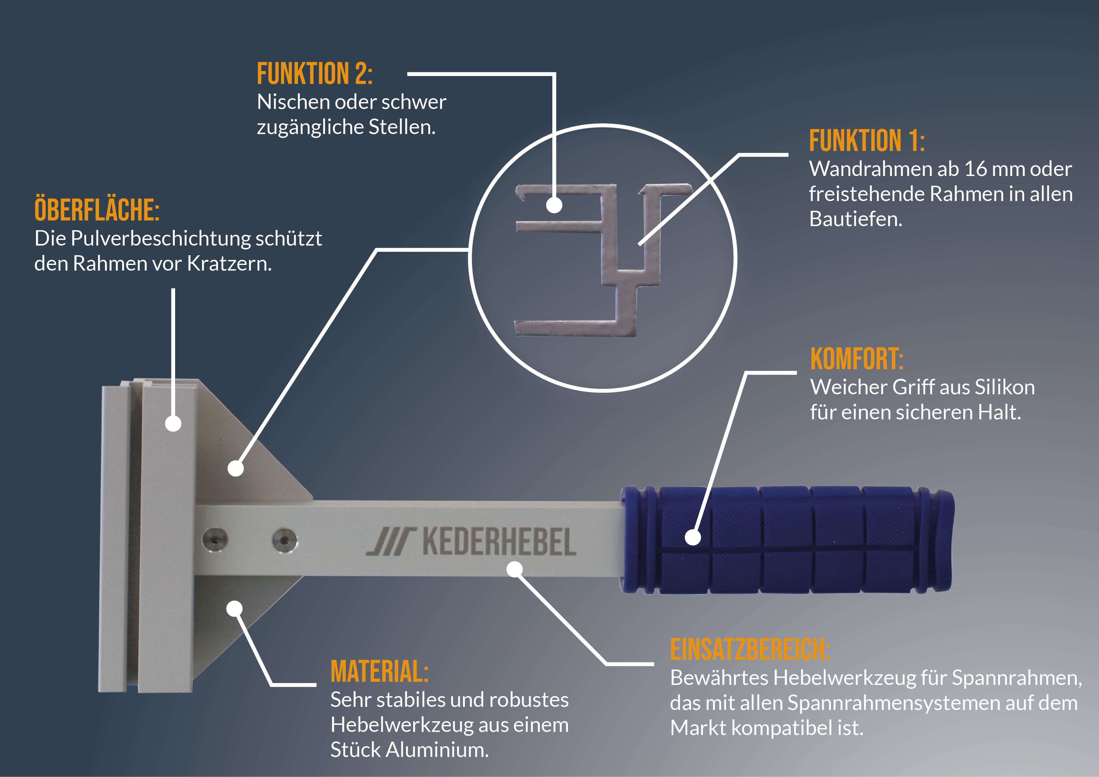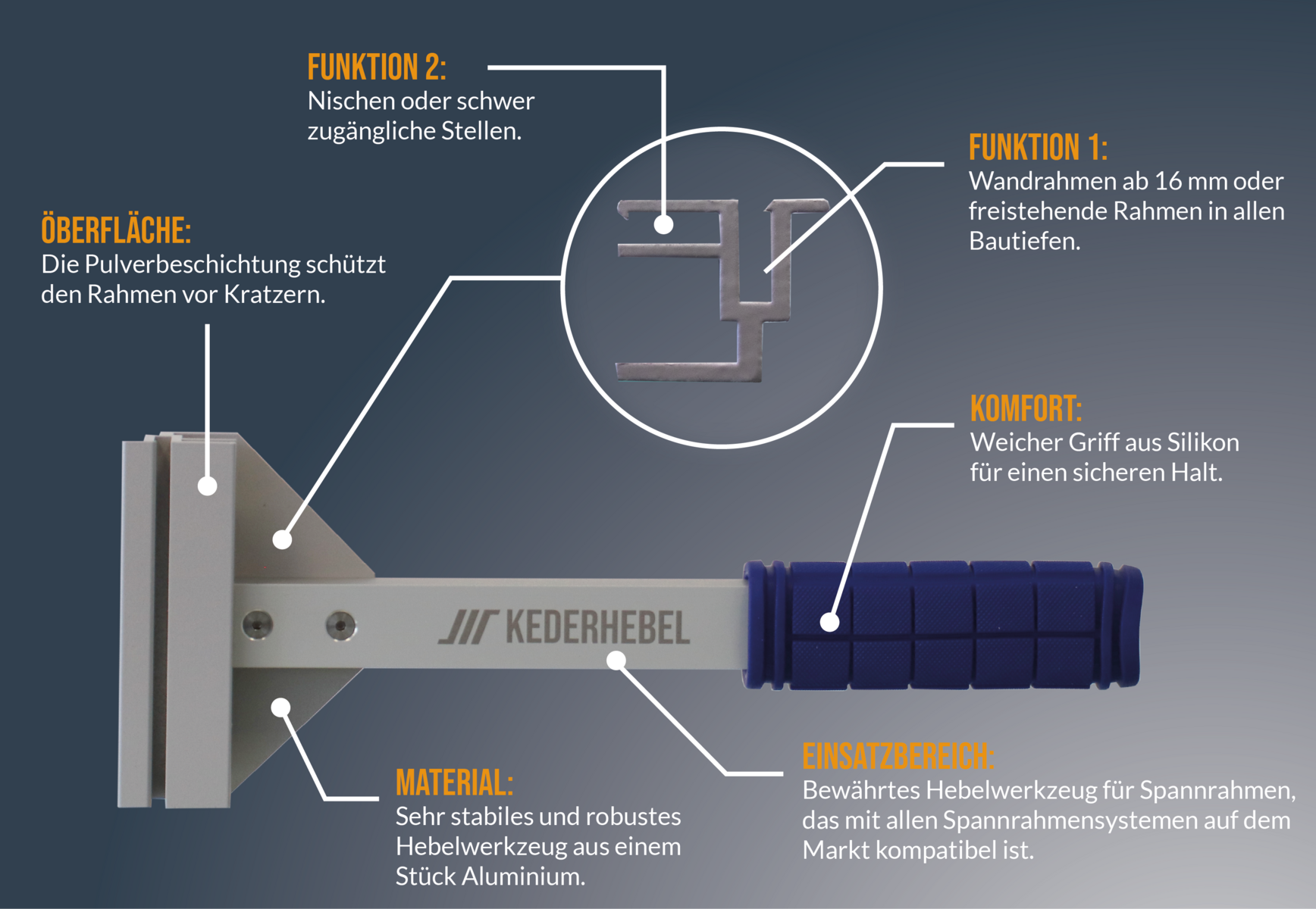 Der Kederhebel ist ein Werkzeug mit dem zu klein konfektionierte Spanntücher doch noch in den Rahmen gedrückt werden können. Dazu einfach die Gummilippe des Spanntuchs in die Nut des Werkzeugs drücken und außen am Rahmen ansetzen. Hebel Richtung Wand drücken und die Gummilippe in den Rahmen drücken.