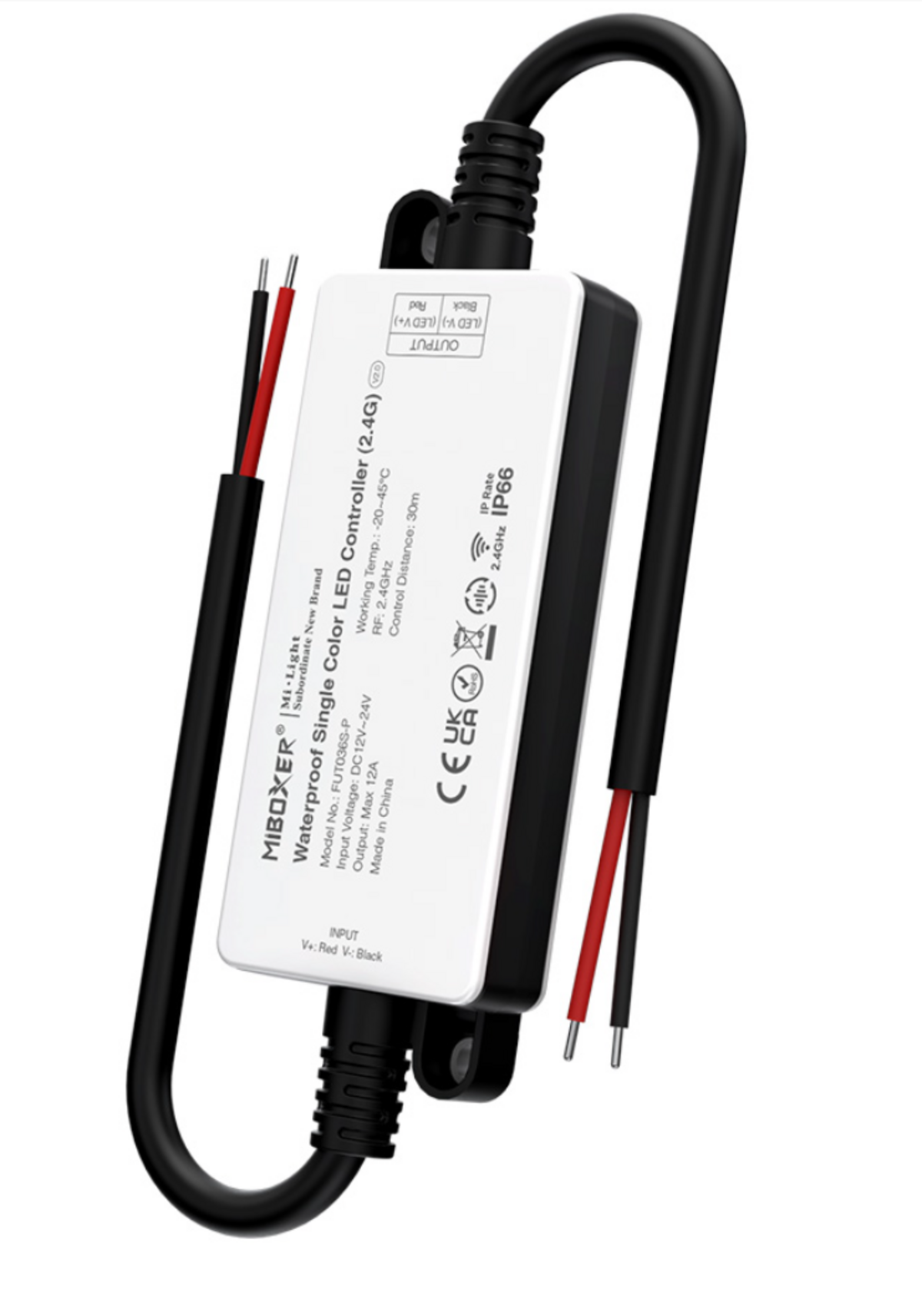 12V-24V Dimmer für Lichtanwendungen im Außenbereich. Max. Output 12A. Der Controller erzeugt das Steuersignal für Led Module oder Stripes.
