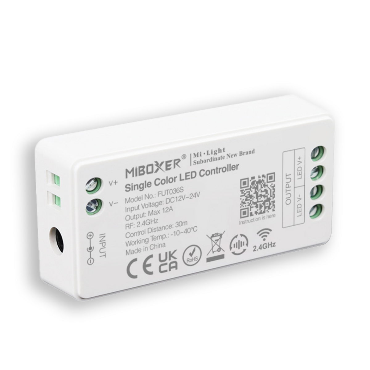 12V-24V Dimmer für Lichtanwendungen. Max. Output 12A. Der Controller erzeugt das Steuersignal für Led Module oder Stripes.