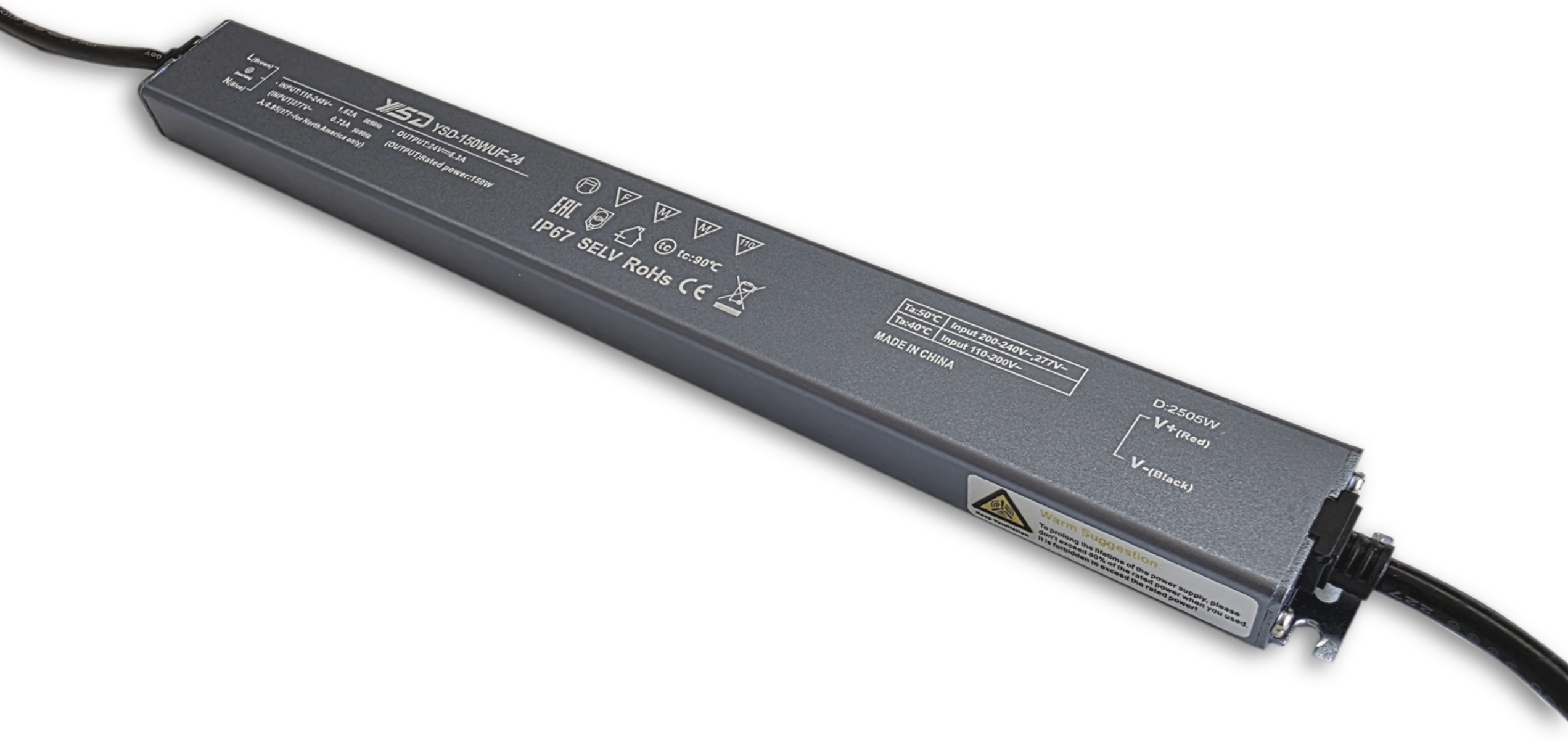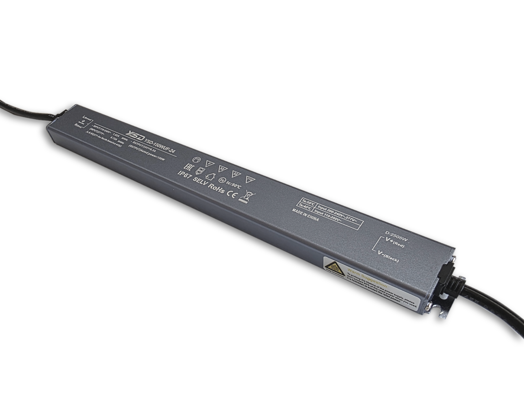 Das Modell YSD-150WUF-24 liefert konstante 24 V DC bei satten 150 W und bis zu 6,25 A – perfekt für leuchtstarke LED-Systeme.Mit einem Spitzenwirkungsgrad von über 93 % wandelt das Netzteil Strom nahezu verlustfrei – weniger Abwärme, längere Lebensdauer.Das ultraflache Lineargehäuse misst nur 18mm in der Höhe und lässt sich selbst in engste Profile oder Möbelnischen integrieren.Dank IP67-Schutzklasse bleibt die Versorgung auch in rauen Umgebungen stabil.Das Netzteil ist gegen Kurzschluss, Überlast, Überspannung und Übertemperatur geschützt.Ob LED-Strips, Panels oder Light-Boxen – dieses Netzteil liefert flimmerfreie, langlebige Power für anspruchsvolle Lichtkonzepte.ACHTUNG: 20% Reserve in der Auslastung einrechnen um eine lange Lebensdauer zu gewährleisten.