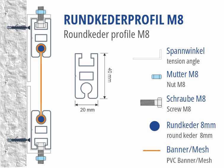 Ein besonders massives Rundkederprofil mit Spannaufnahme für M8 Schrauben. Ideal für sehr große Anwendungen und hohen Windlasten.