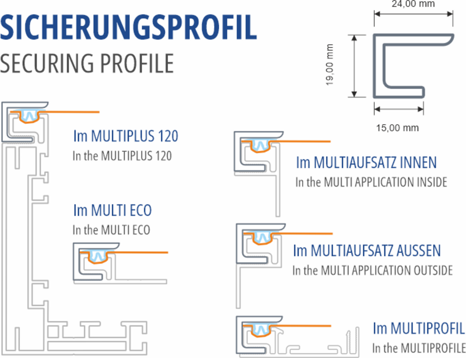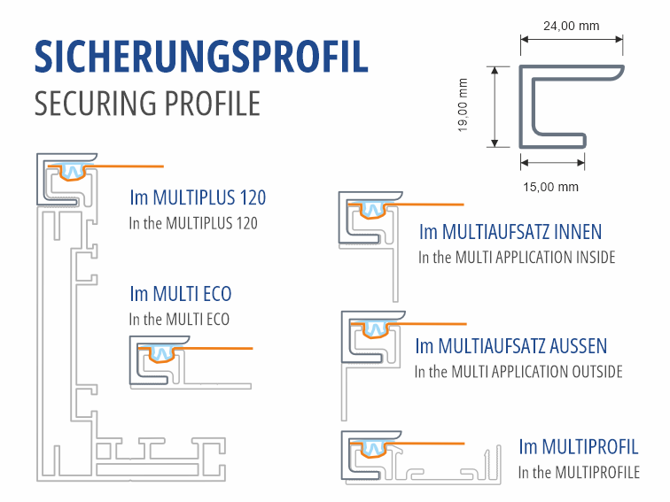 Ein Herausziehen des Spanntuches sowie ein Verlust der Klemmleiste werden zuverlässig verhindert. Das Profil ist in Aluminium natur und eloxiert erhältlich und kann selbstverständlich auch pulverbeschichtet werden. Es bildet einen technisch einwandfreien und zugleich optisch ansprechenden Abschluss des Spannsystems. Der filigrane Rahmen mit 24 mm Breite sorgt für einen sauberen, professionellen Abschluss und schützt die Kunststoffklemmleiste vor Witterungseinflüssen.