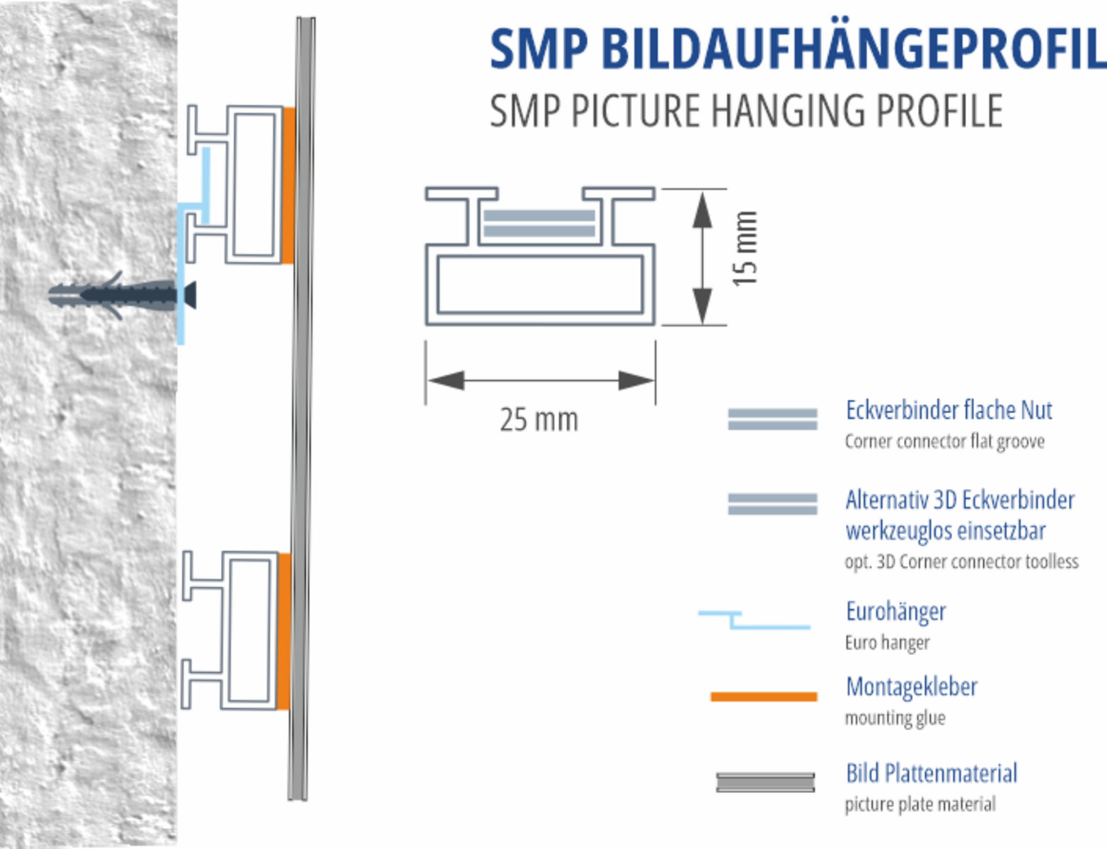 Günstiger als die häufig eingesetzten U-Profile wird dieses Profil an der Rückseite von Bildtafeln verklebt. Eckverbinder und Aufhängehaken hinterlassen bei Ihren Kunden einen professionellen Eindruck!
