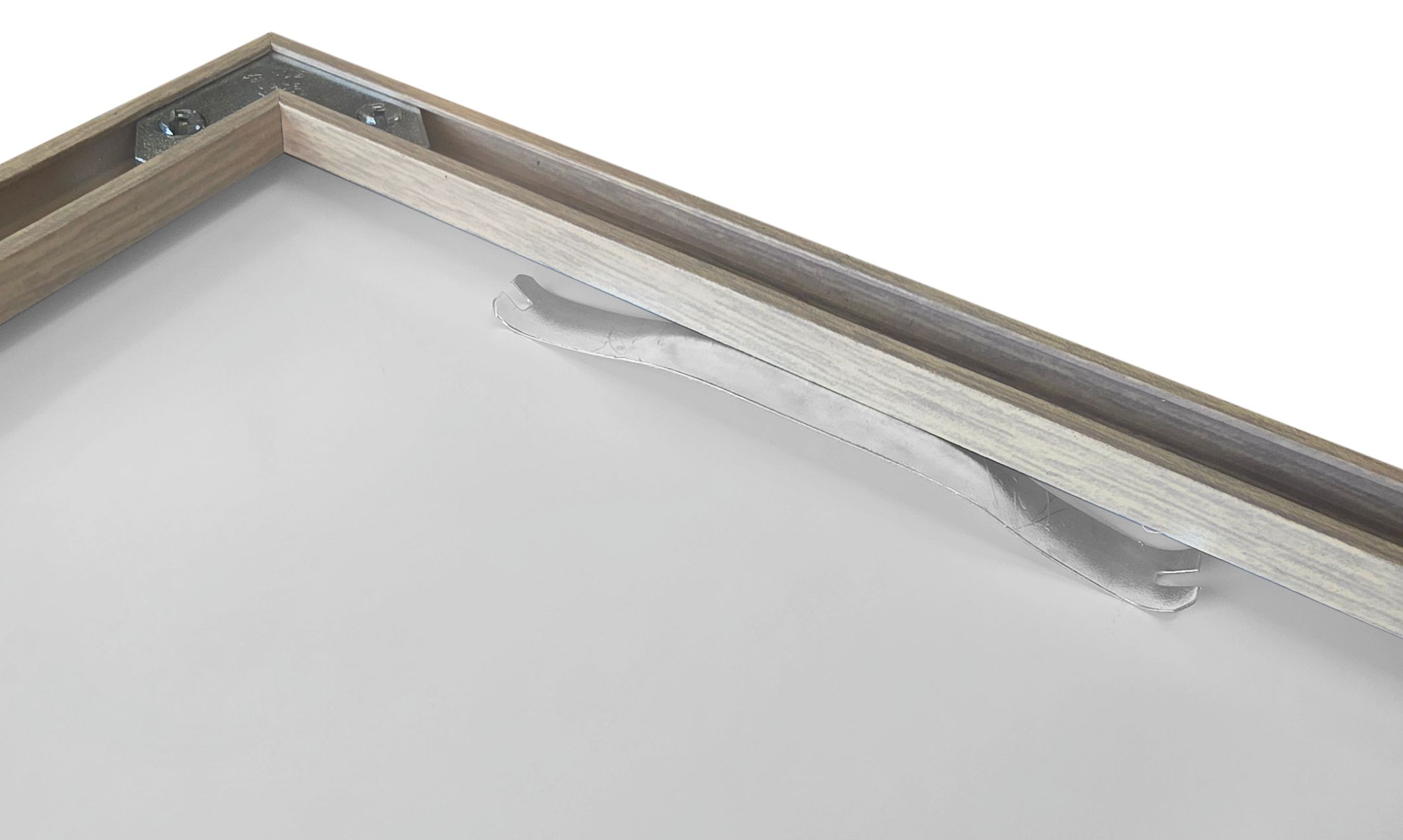 Die Stahlfeder wird auf der Rückseite zwischen Plattenmaterial und Profil eingesetzt und drückt das Material unabhängig von der Plattenstärke nach vorne.